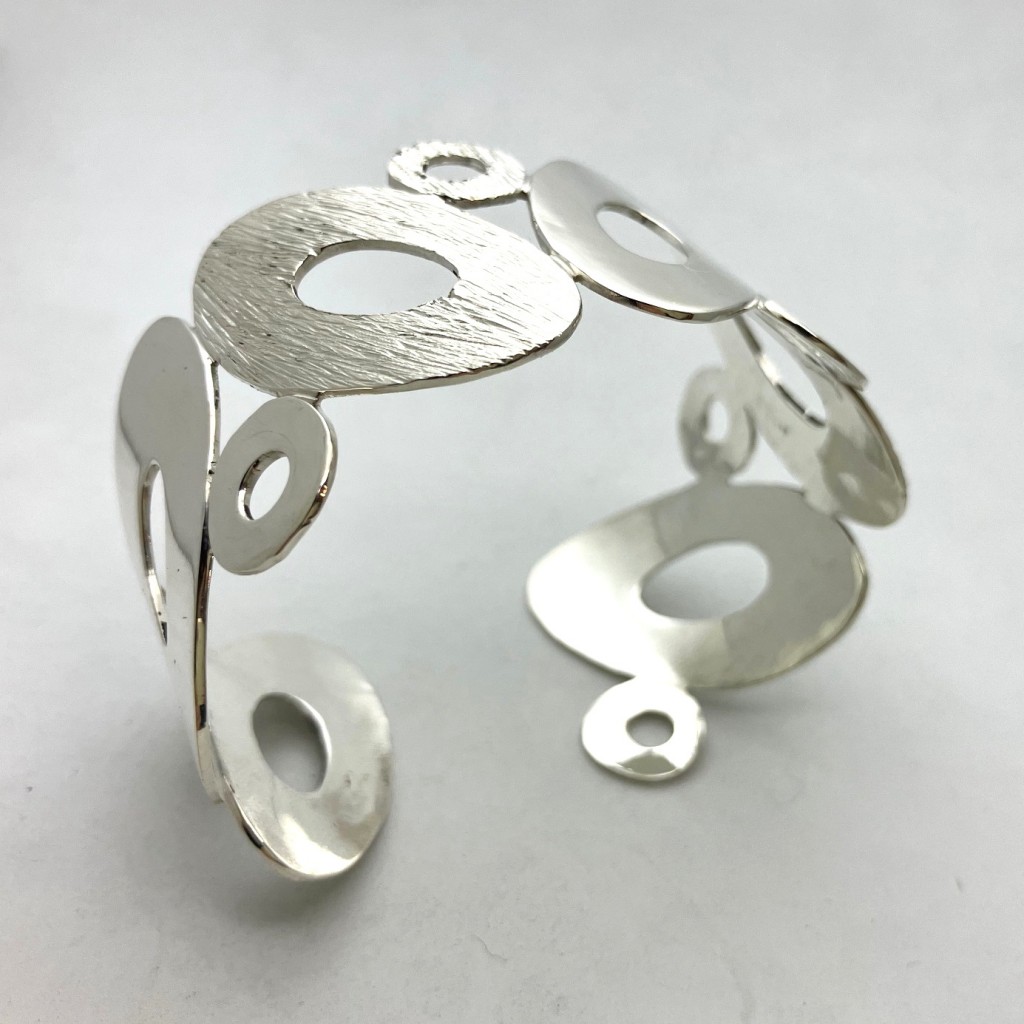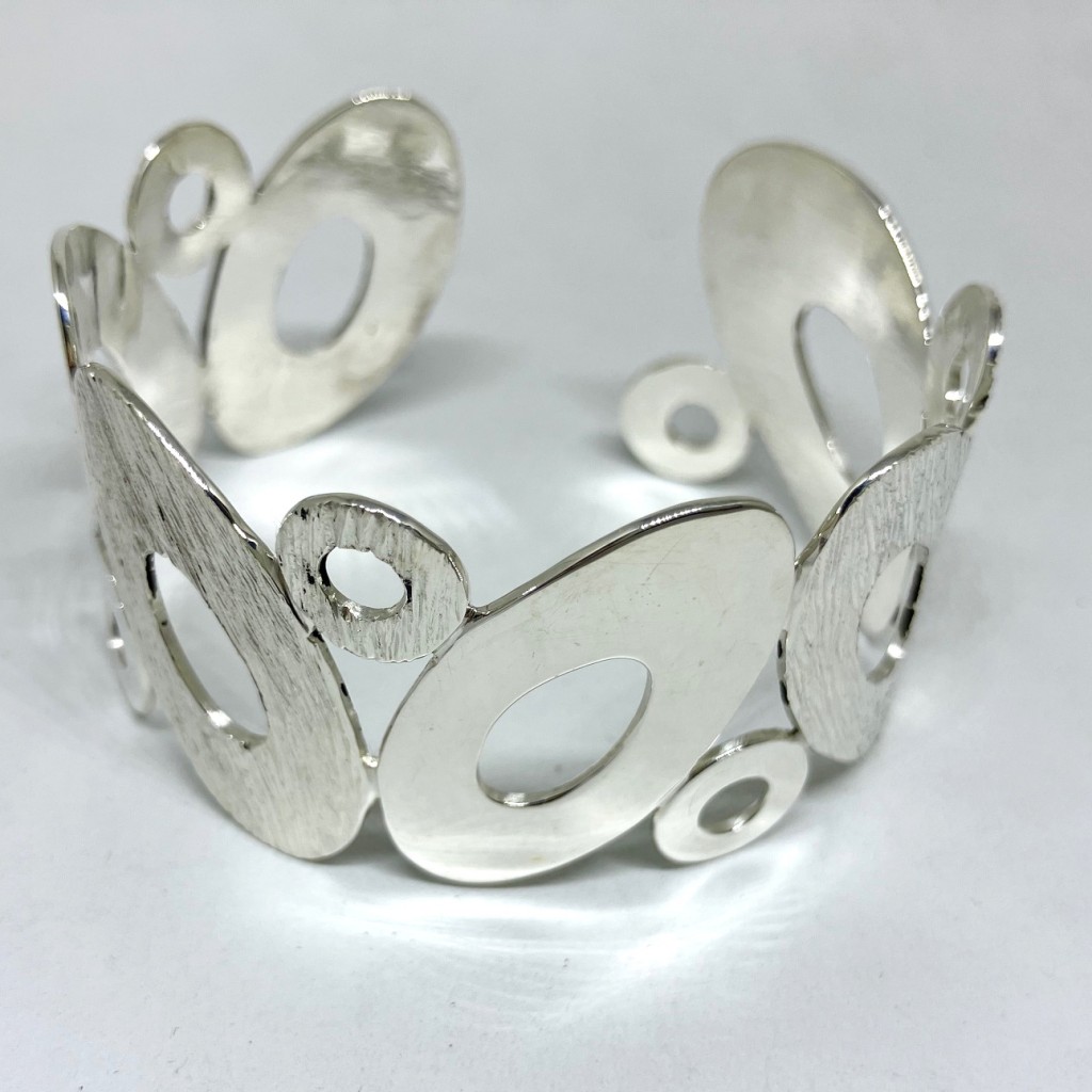 Bracciale a schiava in argento 925/1000 traforato interamente a mano con ovali verticali satinati e lisci