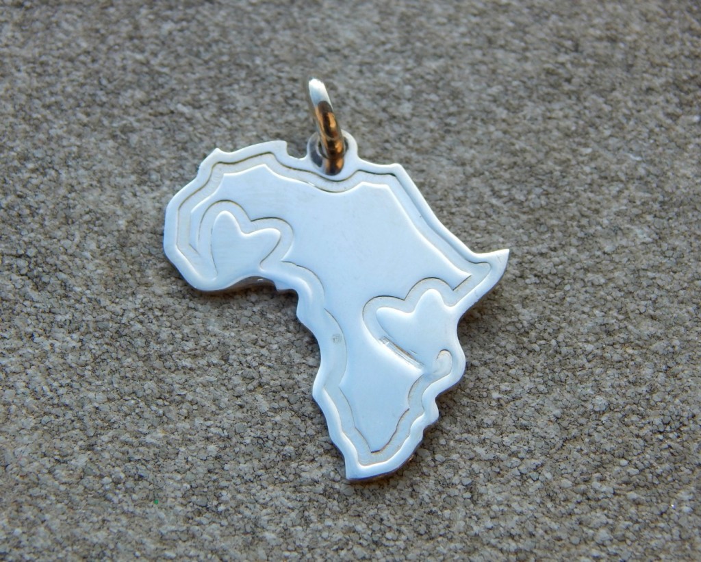Ciondolo Africa in argento 925/1000 contorno dell'Africa e due piccoli cuori in rilievo. La superficie è liscia. Taglia media